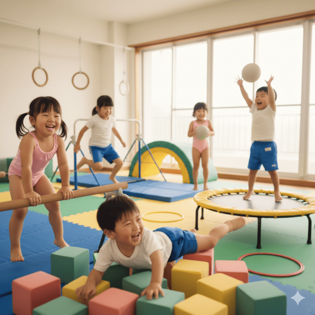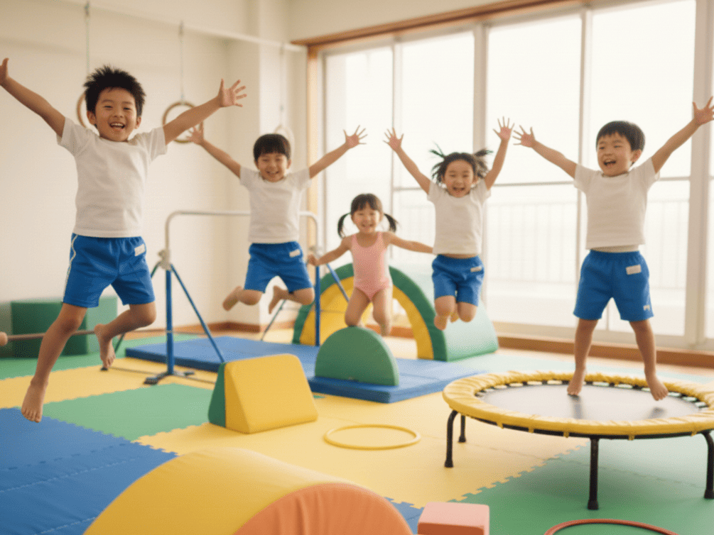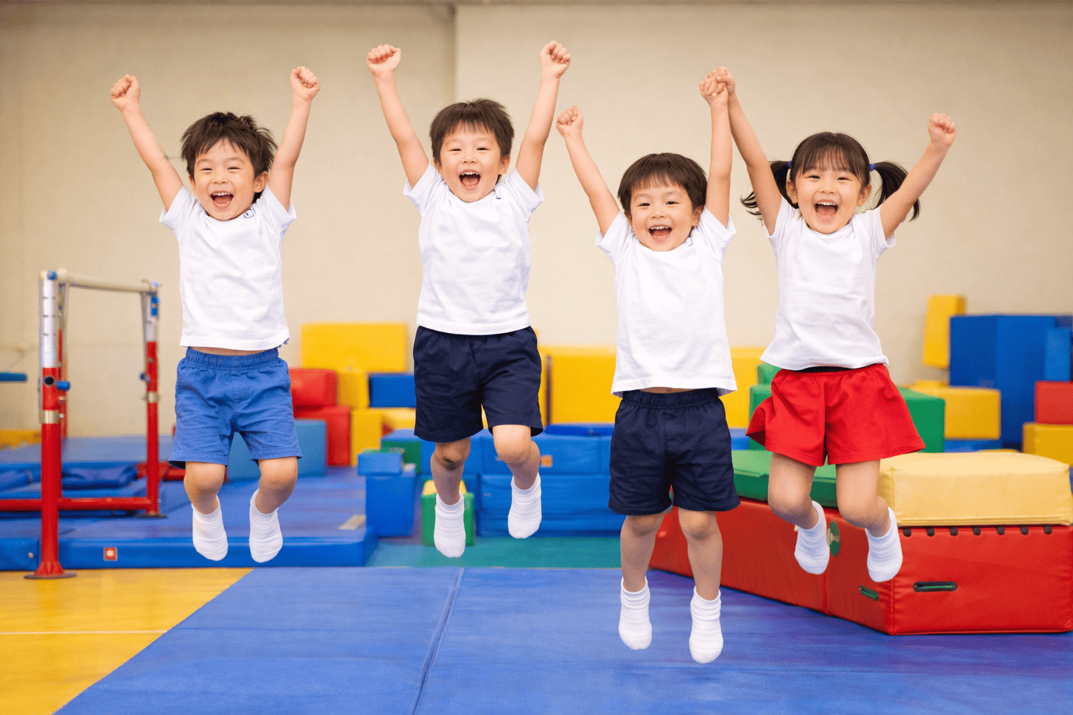 体操を通して楽しく遊びながら、基本的な運動能力を身につけよう!クタクタになるまで跳んで跳ねて過ごします!